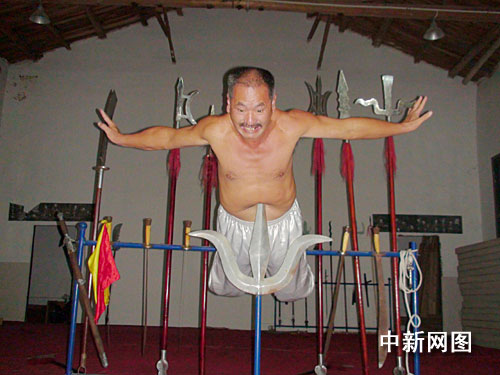中新網(wǎng)永春10月12日電 (林永傳 顏堯民 施由森)以腹部作為支點,雙腳支在鐵欄上,然后整個人身體懸空,普通人一般無法做到這點,而福建永春縣白鶴拳師顏大石卻可以以鋒利的鋼叉作為支點,整個人懸空,其白鶴內(nèi)功令人叫絕。