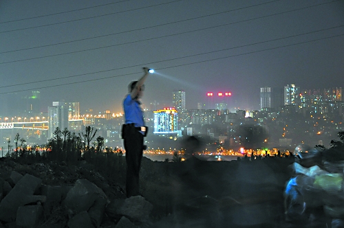 “天很黑,很多行人都看不清路,他就一直高舉著手電筒,好讓大家安全通過……”前日,大渝網Q吧出現了一篇名為《人民警察》的帖子。發帖人“張力”在帖子里展示了一組照片,照片里,幾名警察正在疏導觀看焰火晚會的市民,其中,還有一名民警站在路邊的亂石堆上,一直單手高舉著手電筒為行人照路。照片出來后,這位民警受到了很多網友的稱贊,被尊稱為“燈塔民警”。