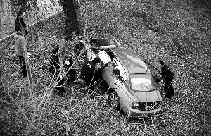車后方坐著一名長發女子,滿臉是血,不時發出呻吟。另一名紅發男子倒在女子腳邊,一臉血跡。由于事發地點偏僻,現場并沒有目擊者。警燈閃爍,可以看到被撞的柳樹下方有一個約15厘米深的凹槽。