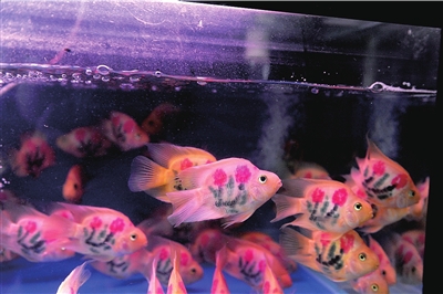 記者走訪了位于高碑店附近的幾個水族區,發現都有這種文身魚出售。這種魚有成人手掌大小,魚身上刻有玫瑰花和各種寓意發財吉祥的圖案。文身魚主要有兩個品種,一種叫“鸚鵡”的紅黃色熱帶魚,另一種是有著兩條長長胡須的白色“招財魚”。