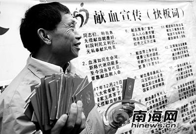 “我健康我獻血,你捐血你快樂,救人生命積功德……”在海口明珠廣場,省血液中心采血車旁,穿著樸素的楊順德,操著四川口音、拿著半導體喇叭重復地向人們宣傳獻血的好處和獻血知識。