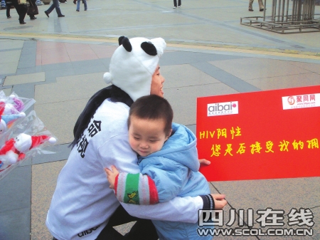 我是“艾滋病毒攜帶者”,能給我一個(gè)溫暖的擁抱嗎?昨日,一群打扮成熊貓模樣的年輕人舉著印有“您的擁抱能給我生存的勇氣”的紅色標(biāo)牌走在春熙路上,他們?cè)趽頂D的人群中穿梭,面帶微笑向路人致意。這些人的一舉一動(dòng)引起了市民強(qiáng)烈好奇,有的人干脆跟在這些年輕人身后看個(gè)究竟。