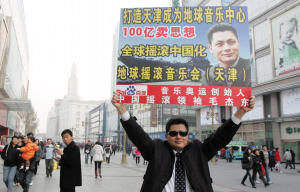 一款黑墨鏡,一襲黑風衣,昨天(12月13日),當一位長相頗似著名影星周潤發的外地男子出現在(天津)和平路上時,引起了不少人的注意。而當他高舉起一幅廣告牌的時候,更有不少人對他的精神狀況產生了懷疑。“打造天津成為地球音樂中心”、“100億賣思想”,遠遠看著廣告牌上這些“雷人”的宣傳語,大伙兒不敢靠近。
