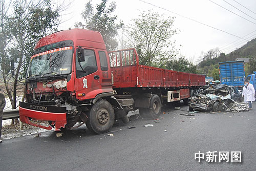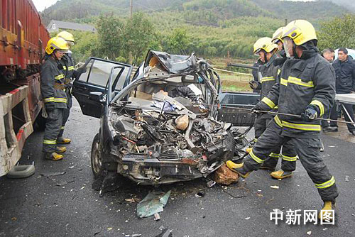 中新網杭州12月15日電(記者 江耘 袁爽)今天中午一時三十分許,浙江杭州臨安市板橋鄉平峰村口的公路上發生一起車禍,一輛小轎車從村口出來時遭大貨車的猛烈沖撞。事故造成了小車內五人中的三人當場死亡,兩人受傷。一旁的一名路人也被殃及受傷。