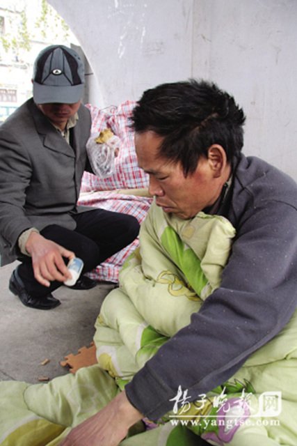 記者隨后來到“大傻”所睡的位置,發現這位綽號“大傻”的民工并沒有睡著,見到記者也是兩眼迷茫,后來他告訴記者,自己名叫王震學,今年46歲,安徽阜陽人,父母過世,只剩下自己孤身一人在外打工求生活,由于腿疼、肺部也有毛病,所以干不了重活,20天前得了重感冒,一直以來發燒不止,后來是一位在附近賣烤紅薯的老師傅給他買了一瓶安乃近。和王震學睡在一起的小湯說,王震學已經20多天沒有起過床,這幾天也是基本吃不下飯,我真怕再不將他送進醫院,他也只有等死了。