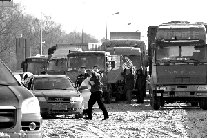 昨日下午1時,八達嶺高速路水屯出口處,出京方向,大貨車排成約20公里的長龍,前后看不到盡頭。由于長時間沒有挪動,一些司機或下車探路或在車上睡覺。交警介紹,目前水屯路口積雪清理完畢,車輛今日可完全疏散。據了解,累計數千輛大貨車因雪被困在此兩日夜。