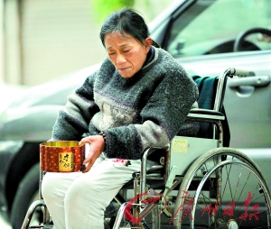 在廣州市人民中路的高架橋下,人們經常會看見一個扶著輪椅佝僂獨行的女人。每天清晨,她從這里出發,輾轉于各個寺廟、教堂乞討,每天深夜,她又回到這里,蜷縮在一個網吧的門前露宿。