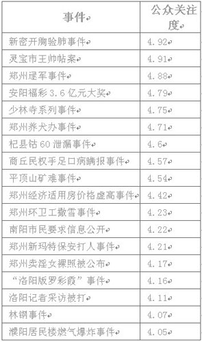 據(jù)了解,該報告的自2009年12月14日開始,歷時近一月,共有10078名網(wǎng)友參與打分。報告業(yè)示,2009年度發(fā)生在河南境內(nèi)具有較大影響力的18個公共事件,新密開胸驗肺事件和靈寶市王帥帖案名列榜首,而在重大事件的處理上,網(wǎng)民認(rèn)為濮陽居民樓燃?xì)獗ㄊ录,?dāng)?shù)卣幚碜顬榈卯?dāng)、及時,受到網(wǎng)民一致好評。