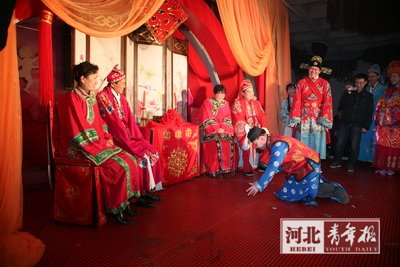 新娘孫蓓說(shuō):“現(xiàn)在,人們對(duì)傳統(tǒng)的東西都淡化了,我們希望通過(guò)自己的行動(dòng)喚起更多人對(duì)傳統(tǒng)文化的興趣!