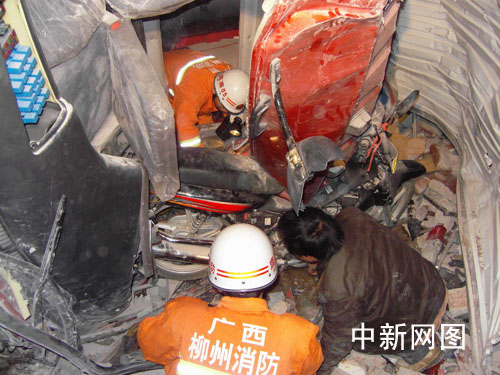 柳州鹿寨消防中隊接警后,立即出動一輛搶險救援車和6名官兵趕往事故現場。在現場,已聚集了眾多民眾,公安、120醫護人員已經到場。此時出事貨車車身已“霸占”了三個門面,車頭鉆入一修理店店鋪,地上散落著鐵礦和從屋頂掉落的石棉瓦。