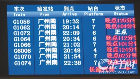 到晚上6時30分,現場LED顯示屏顯示,從原定下午5時06分發出的9個班次列車都處于晚點狀態中,車站所有站臺上都沒有列車停靠,數千旅客因此滯留廣州南站內。