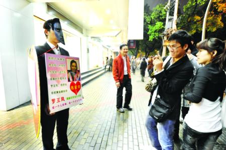 這一次,“阿凡達”出現在福州八一七路南街公交站附近的人行道上,只見他身上掛著一塊牌子,手里還捧著一塊,上面寫著:“哥膝下有黃金”,“哥喊你來福州相親”,“鳳姐明天我要嫁給你”,“一見鐘情”,“求求你,迷戀哥,哥真的不是傳說”……更引人注意的是,他手上捧著的那塊牌子上,還有一張羅玉鳳的照片。