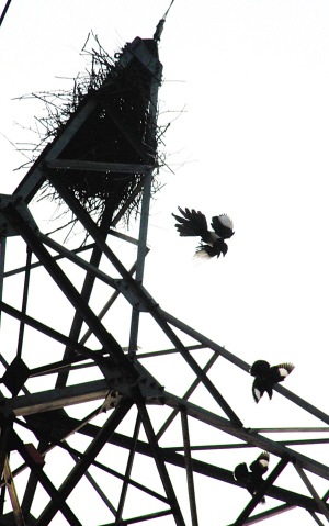 附近的居民武先生告訴記者,就在半個月前,他散步路過這座高壓電線架下,忽然有一根細樹枝從空中掉了下來,隨之聽到上面?zhèn)鱽硪魂囮噽偠镍B叫聲。抬頭一看,發(fā)現(xiàn)是兩只喜鵲銜著樹枝站在電線架頂部的鋼架上,像是在討論什么似的——估計這是一對夫妻,它們開始搭窩了。