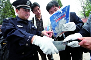 昨日,西城警方為提高全區112所中小學幼兒園的安保,為校園配發自衛噴霧器和防割手套,與之前配發的警用鋼叉配合使用。