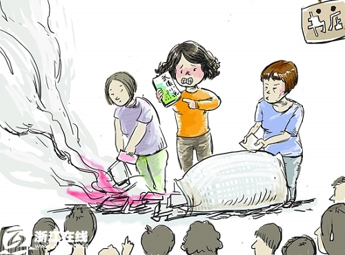 店主看到了過來阻攔,雙方發生了爭執。很快,警察來了。百官派出所的金警官向記者證實,當時雙方的情緒都很激動。說起燒書,家長說,這實在是無奈之舉,“這樣的書不應該在校門口賣,影響孩子的學習”。而店主則稱,他們是借給大人看的,這樣燒書影響他們的生意。