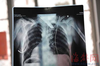 前晚,在第一醫院急救室,經過4個多小時的搶救,醫生將匕首從小勇身上取出,發現這把匕首的刀尖扎斷了1厘米。由于小勇肺部被刺中,昨天上午,醫生再次進行了3個多小時的手術,切除了受傷的部分肺,直到下午,小勇才挺過來。“挺了一夜,現在總算醒了過來。”楊女士一夜沒睡,守在手術室外7個多小時,生怕兒子再醒不過來。不過,由于傷勢嚴重,小勇目前戴著氧氣呼吸,仍未脫險。