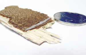 記者看到304室北面小屋的門,有一部分用牛皮紙貼上,輕輕撕開紙,赫然出現一個大洞。她說這是有天早晨喊女兒起床時敲通的。一個年過半百的女子,竟然敲門時就輕易地把門敲通,可見這門板的質量。果然,記者很輕易就掰下一塊面板,這種復合木板的厚度不到3毫米,難怪經不起“敲”。