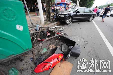 目擊者鄭小姐說(shuō),當(dāng)時(shí)她騎著電動(dòng)車,在豪華轎車后面,與其同向行駛。豪華轎車先刮碰到一名騎自行車的女子,接著,非機(jī)動(dòng)車道上一名騎摩托的男子和一名騎電動(dòng)車的男子被撞飛,高度超越小車車頂,又重重摔到了人行道上。附近商家則說(shuō),豪華車是為躲避騎自行車的女子,打方向盤向右避讓,隨即撞上兩名騎車的男子。“如果沒(méi)這棵樹就慘了,可能更多人被撞!备呦壬男≤嚠(dāng)時(shí)就停在事發(fā)地附近等朋友。他說(shuō),他先是聽(tīng)到一聲刺耳的剎車聲音,循聲看去,看到兩名騎車男子被撞飛。另有目擊者說(shuō),豪華車撞人后繼續(xù)往前沖,撞倒路邊的電話亭,再撞上行道樹后才停下。受傷的三人中,一人昏迷不醒,滿身是血。豪華車司機(jī)沒(méi)有受傷。