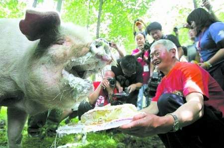 王福清、萬興明和劉大會(huì)只好將蛋糕拿到樹林里去。“豬堅(jiān)強(qiáng)”嗅了嗅從來沒有吃過的蛋糕,張開大嘴吃起來。人們爭(zhēng)相去看,為它拍照,“豬堅(jiān)強(qiáng)”被圍得嚴(yán)嚴(yán)實(shí)實(shí)。王福清還給它臉上抹上了奶油。