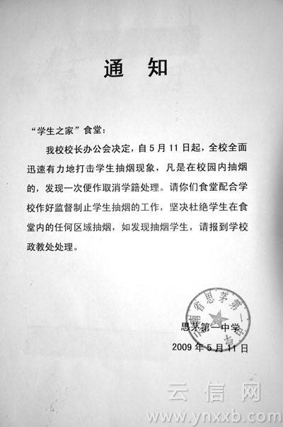 2010年6月1日,普洱市思茅區教育局向區屬23所校園發出《思茅區教育局關于在校園內公共場所禁煙的通知》(以下簡稱《通知》)!斑@是云南省第一家自發進行控煙工作的教育單位。”云南省健康教育所控煙辦公室主任趙白帆說。