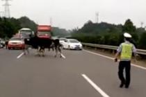 奶牛高速路上跑 交警來幫忙