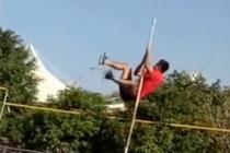校運會男生撐桿跳空中停滯往上攀