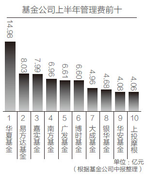 華夏、易方達、嘉實、南方、博時、廣發、大成、華安、銀華、上投摩根的管理費收入位于前10,合計高達70.51億元,已接近全行業的一半。華夏以14.6億元的管理費收入遙遙領先,易方達、嘉實、南方、博時的管理費收入分別為8.03億元、7.99億元、7.35億元、6.76億元。