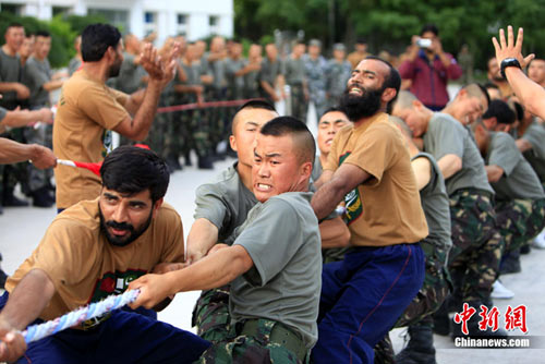 7月初,代號“友誼—2010”的中國巴基斯坦反恐聯合訓練在中國寧夏青銅峽地區展開,此次訓練主要以邊境地區山地聯合反恐作戰為課題。開訓以來,參訓官兵每天不論是訓練交流還是開展文體活動,都混編為A連和B連為單位組織實施,盡管語言溝通并不暢通,但中巴兩國士兵在手勢和眼神的幫助下,依然能夠協作訓練默契自然,完成動作標準規范。中新社發 杜洋 攝