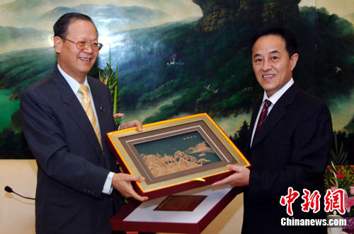 7月28日傍晚,中國最高人民法院副院長、中國法學會審判理論研究會副會長、二級大法官奚曉明先生(右)與海峽兩岸法學交流協(xié)會(臺灣)理事長廖正豪(左)先生互換禮物。當日中國最高人民法院副院長奚曉明在福州福建會堂會見來自海峽兩岸的近二百名知名法學家、司法實務界人士,其中來自臺灣29名法學及司法嘉賓。海峽兩岸司法實務研討會即將在福州舉行。攝影:張麗君
