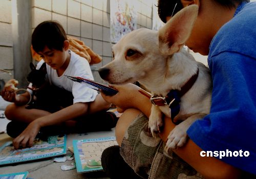 美國南加州二十三處火場十月二十九日控制得只剩七處,集中在圣地牙哥和橙縣,失去家園的小災民和寵物在收容中心相依為命。中新社發 賈國榮 攝