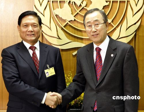 中共中央政治局委員、北京市委書記、北京奧組委主席劉淇三十一日在紐約聯合國總部與聯合國秘書長潘基文舉行會晤。中新社發 李靜 攝