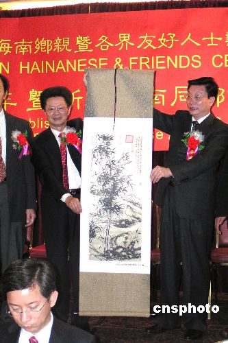 中國國務院僑務辦公室副主任馬儒沛十一月四日代表國僑辦向歡度五十周年華誕的澳大利亞新州海南同鄉會贈送禮品。中新社發 葛明 攝