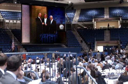 各方關(guān)注的中東和會當(dāng)?shù)貢r間十一月二十七日十一時在美國馬里蘭州安那波利斯的美國海軍學(xué)院開幕。在美國總統(tǒng)布什的主持下,巴勒斯坦民族權(quán)力機構(gòu)主席阿巴斯和以色列總理奧爾默特的雙手緊緊握在一起,現(xiàn)場響起了熱烈的掌聲。中新社發(fā) 邱江波 攝
