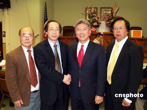 12月17日,美國洛杉磯華埠中華會館已有114年歷史,選出的2008年新一屆主席伍競群和副主席黃新周,在接受現任主席張自豪的祝賀。中新社發 盧威 攝
