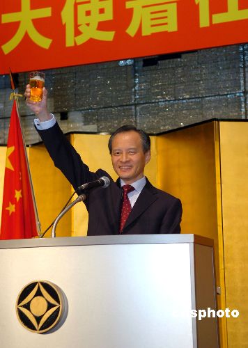 12月18日晚上,中國駐日使館在東京新大谷飯店舉行崔天凱大使到任招待會,日本各政黨代表,政府各部門代表,各大企業代表以及在日華僑華人代表近200人參加。圖為崔天凱大使在致詞完后舉杯祝酒。中新社發 滕劍峰 攝