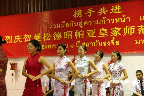 泰國曼松德昭帕亞皇家?guī)煼洞髮W孔子學院十九日在該校隆重舉行孔子學院成立周年慶典活動,慶典儀式后泰中兩國學生以“多元文化的融合,和諧世界的構建”為主題共同表演了一場精彩的文藝演出,圖為泰中兩國學生的旗袍服裝表演。中新社發(fā) 顧時宏 攝