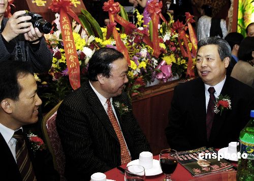 當地時間一月八日晚,中國駐紐約總領事館總領事彭克玉大使(右)在紐約曼哈頓華埠美東僑界為他舉辦的歡迎晚宴上與華聯總會共同主席梁冠軍(左)和陳清泉(中)親切交談。中新社發 鄧悅 攝