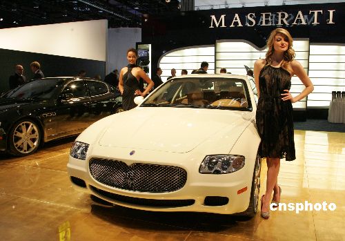 底特律當地時間一月十三日,在2008年北美國際汽車展上,瑪莎拉蒂豪華房車與時尚美女華麗現身。中新社發 潘索菲 攝
