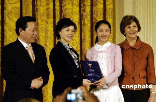 中國文化部部長孫家正(左一)今天上午在美國白宮與美國總統(tǒng)夫人勞拉·布什(右一)一起向中國福利會上海少年宮“小伙伴藝術團”代表陳白樺老師(左二)、李蒙初同學(右二)頒發(fā)“站得更高”獎狀。中新社發(fā) 邱江波 攝