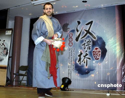4月5日,第七屆“漢語(yǔ)橋”世界大學(xué)生中文比賽美國(guó)紐約地區(qū)預(yù)賽在紐約大學(xué)舉行。來(lái)自美國(guó)東部7所大學(xué)的15名參賽者以中文演講和才藝表演的方式參賽。圖為來(lái)自俄亥俄州立大學(xué)的石逵思十分投入地表演“數(shù)來(lái)寶-茶館開(kāi)場(chǎng)白”。他最終獲得第三名并將和另外兩名選手一道前往中國(guó)參加決賽。中新社發(fā) 鄧悅 攝