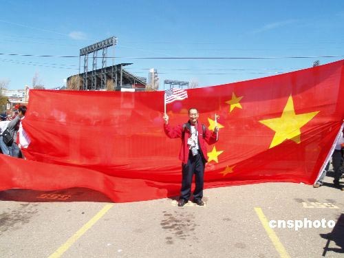 當地時間4月9日,在歡迎北京奧運圣火傳遞舊金山的隊伍中,美國清華大學校友會打出的5米長的巨幅五星紅旗耀眼奪目。作者: 盧威