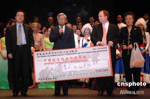 當地時間五月十五日晚,南加州華僑華人在洛杉磯縣圣蓋博市舉行為四川地震災區賑災義演晚會,當地華僑華人、社團、企業和留學生等當場為災區捐款二十一萬多美元。圖為中國駐洛杉磯總領事張云(前左二)表示,總領館將盡快把善款轉交給地震災區。中新社發 張煒 攝