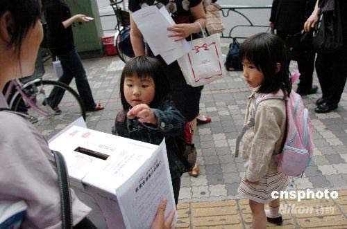 5月18日,一位日本小朋友為四川大地震災區捐款。當日,日本僑報社創辦的星期日漢語角舉行第40次交流會,主題為“向四川震區人民獻愛心”募捐和義賣活動。漢語角參加者來到繁華的池袋車站進行街頭募捐,全力支援中國抗震救災。中新社發 段躍中 攝