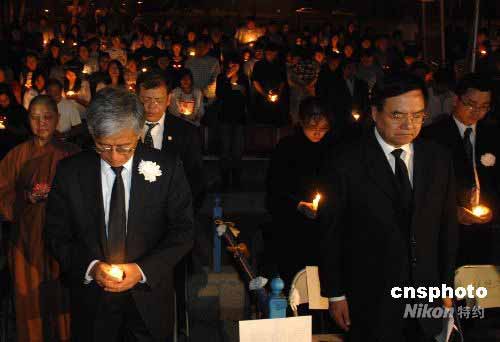 南加州悼念中國汶川地震遇難同胞燭光追思會當地時間五月二十一日晚在美國加州蒙特利公園市舉行。各界人士手捧蠟燭在夜色中默默祈禱,悼念中國汶川地震遇難同胞,愿逝者早日安息,生者更加堅強。圖為中國駐洛杉磯總領事張云(前左)、南加州華人聯合總會會長程遠(前右)和大家一起為遇難同胞默哀。中新社發 張煒 攝