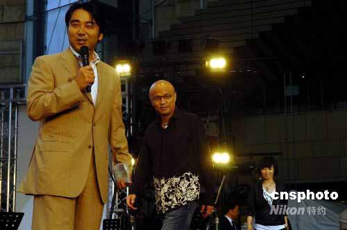 5月25日傍晚,中日兩國著名歌手齊聚東京六本木新城為四川地震災區舉行露天賑災演唱會。著名歌手孫國慶、斯琴格日勒、黃悅專程從中國趕到東京參加演出,感謝地震以來日本各界給予中國的支持與幫助。圖為孫國慶、斯琴格日勒在義演現場。中新社發 朱沿華 攝