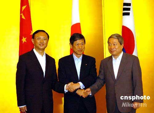 6月14日下午,正在日本進行訪問的中國外長楊潔篪與日本外長高村正彥、韓國外相柳明桓舉行了共同會見,就九月將在日本舉行的中日韓三國領導人會議進行磋商。中新社發 朱沿華 攝