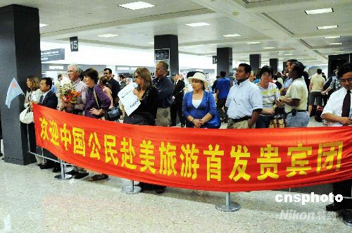 當地時間六月十七日晚,中國公民赴美旅游首發團抵達華盛頓杜勒斯國際機場,美國商務部、機場所在地郡政府和當地旅游社在機場等待迎接首發團到來。該團在華盛頓將破例受到美國商務部重視,將以有史以來最高接待規格接待中國旅游團,為他們安排高規格行程。古鐵雷斯部長將親自接待二百四十名中國游客。中新社發 邱江波 攝