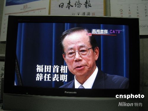 9月1日晚9時30分,日本首相福田康夫在首相官邸舉行記者會見,向國民表明決定辭職。圖為日本電視臺直播福田首相決定辭職的記者會。福田康夫2007年9月26日接替安倍晉三擔任首相,在任期不滿一年。 中新社發 段躍中 攝