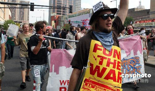 來自全美各地的數千名反戰人士一日在位于明尼蘇達州首府圣保羅的共和黨全國代表大會會場外示威,反對即將獲得共和黨總統候選人提名的亞利桑那州國會參議員麥凱恩支持布什政府的伊拉克政策。中新社發 李靜 攝