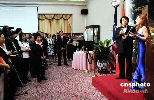 當地時間九月九日,在中國駐美大使館舉行的奧運成功答謝招待會上,北京奧運開幕主題歌《我和你》再度激蕩中美各界朋友的內心。圖為來自華盛頓著名專業合唱團職業歌唱家用意大利美聲唱法為招待會四百余名嘉賓演唱了這首歌曲,贏得了熱烈掌聲和贊揚。中新社發 邱江波 攝